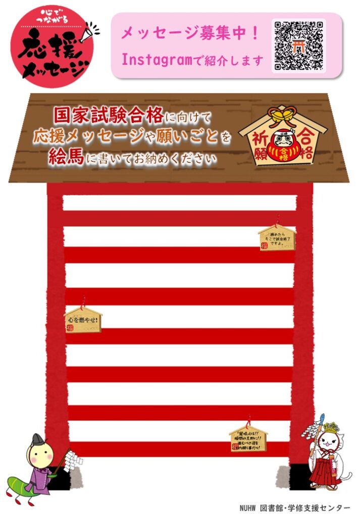 図書館・学修支援センターでは、今年も国家試験に挑戦する皆さんを応援するメッセージや願い事を募集します❗️ 受験生への温かい応援メッセージ💌試験に臨む自分自身への決意🔥ともに頑張る仲間へのエール🌈 あなたの想いを、ぜひ言葉にして届けてください🌟 絵馬(メッセージカード)は図書館1階ロビーに設置しています📍どなたでもご参加いただけます✨ 皆さんの応援が、受験生の大きな力になります💪 たくさんのメッセージをお待ちしています😊